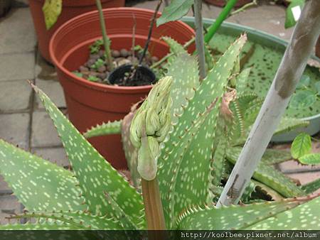這盆蘆薈是朋友分株送給我的,因為他的葉子刺刺的,我都不太想好好地照顧他,所以觀葉植物被我拿來當實驗品,讓他撐到開花結果。回想第一次看到蘆薈開花,有點意外。那時我還住在淡水,這盆被擺在101個北面陽台,吃苦耐勞,最後抽出長長的花莖,開出桔色小花。