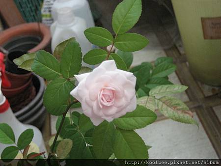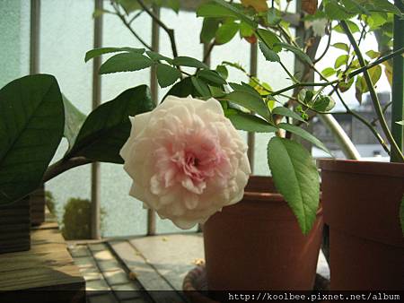 這算是古典玫瑰的一種,花雖然小朵,卻很香。名字很中國,據說真的是中國傳到歐洲去的。目前種在陽台的玫瑰裡算她最早開花。在頂樓的玫瑰,因為遭到切葉蜂無情的侵襲,葉子被啃得光溜溜的 T.T