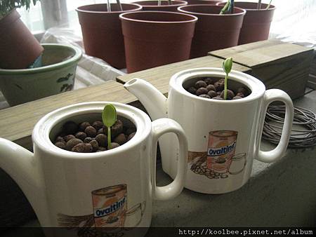 每天換一次水,大約泡個3~4天,就看到有幾顆已經從尖端露出白白的芽點。我不貪心,因為如果真要種到可以開花的大樹,我家也擺不下,所以就拿之前的茶壺當花器,所有的種子分成兩半,就種進去了。最上面本來想要鋪麥飯石的,因為份量不夠,就拿發泡煉石充數。每天再用噴霧氣噴一些水,今天就看到有小朋友探出頭來啦!